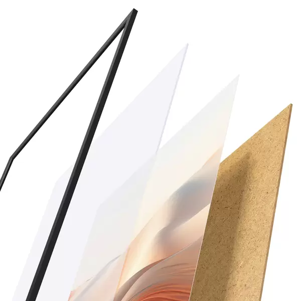 Plakát se skládá z rámu, plexiskla, tištěného obrazu a dřevotřískového podkladu. Díky úchytům na zadní straně lze plakát ihned zavěsit na zeď.
