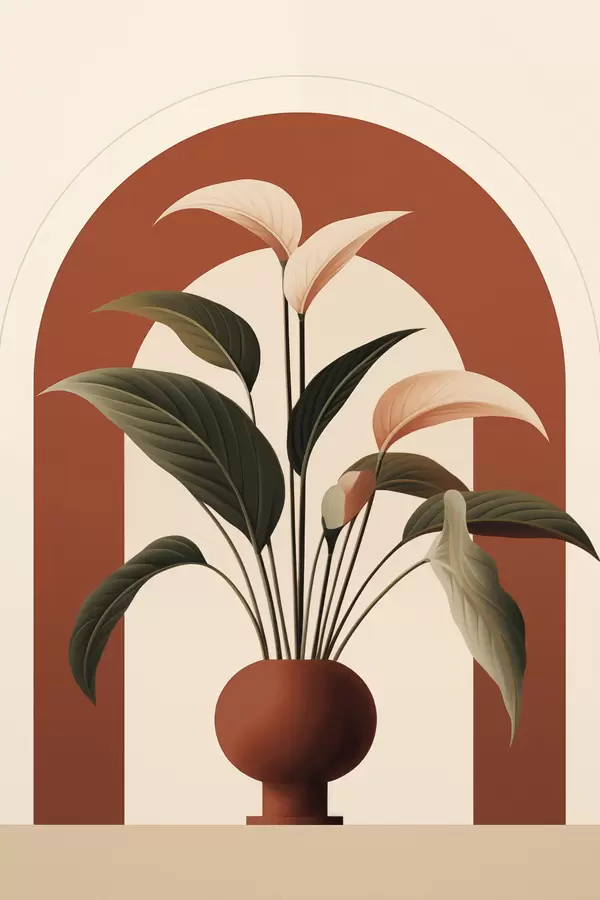 Úvodní stránkaKatalog posterůPostery přírodaPoster Abstraktní rostlina v květináči s velkými zelenými a béžovými listy před krémově zbarveným obloukem s terakotovým akcentem Č. f47032