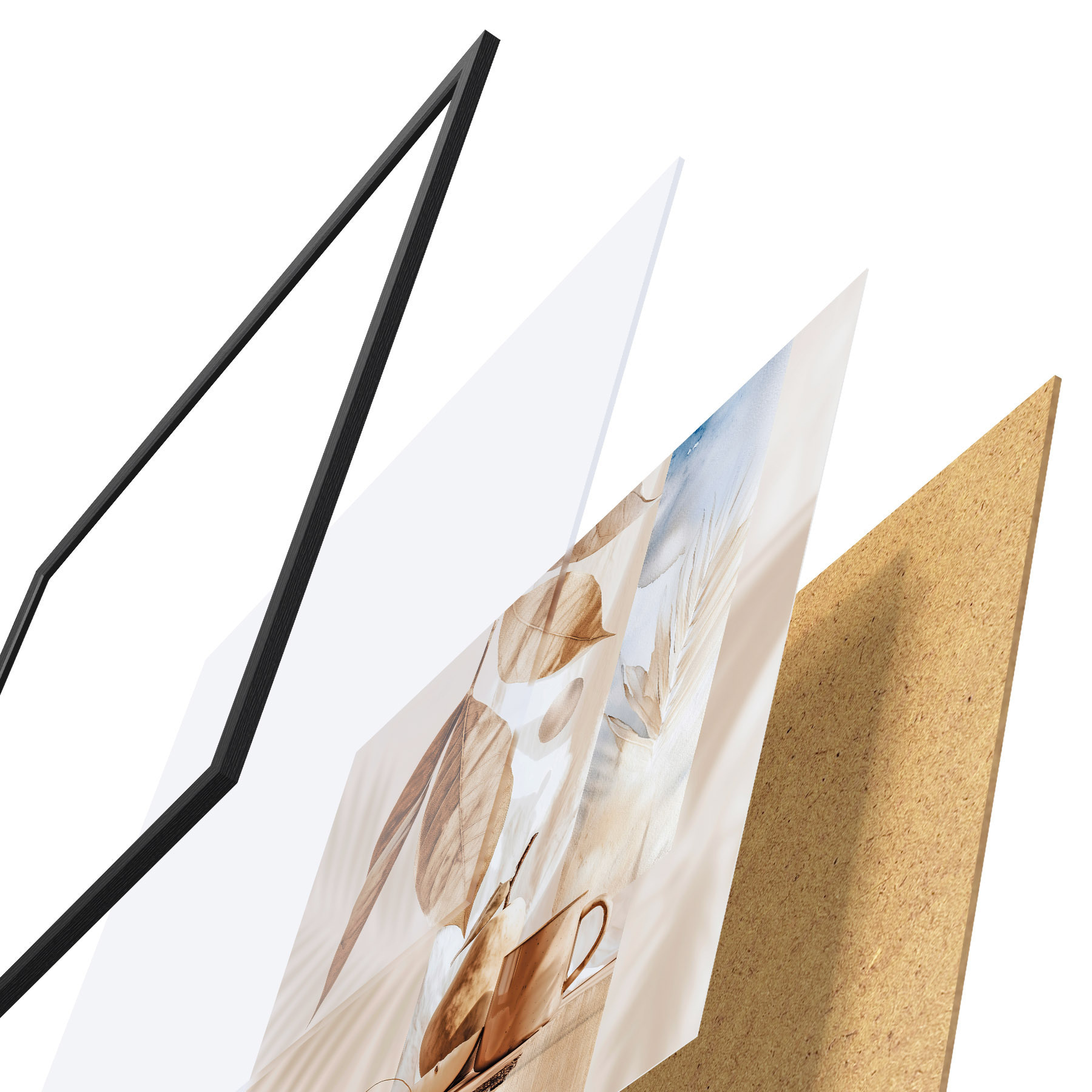 Plakát se skládá z rámu, plexiskla, tištěného obrazu a dřevotřískového podkladu. Díky úchytům na zadní straně lze plakát ihned zavěsit na zeď.