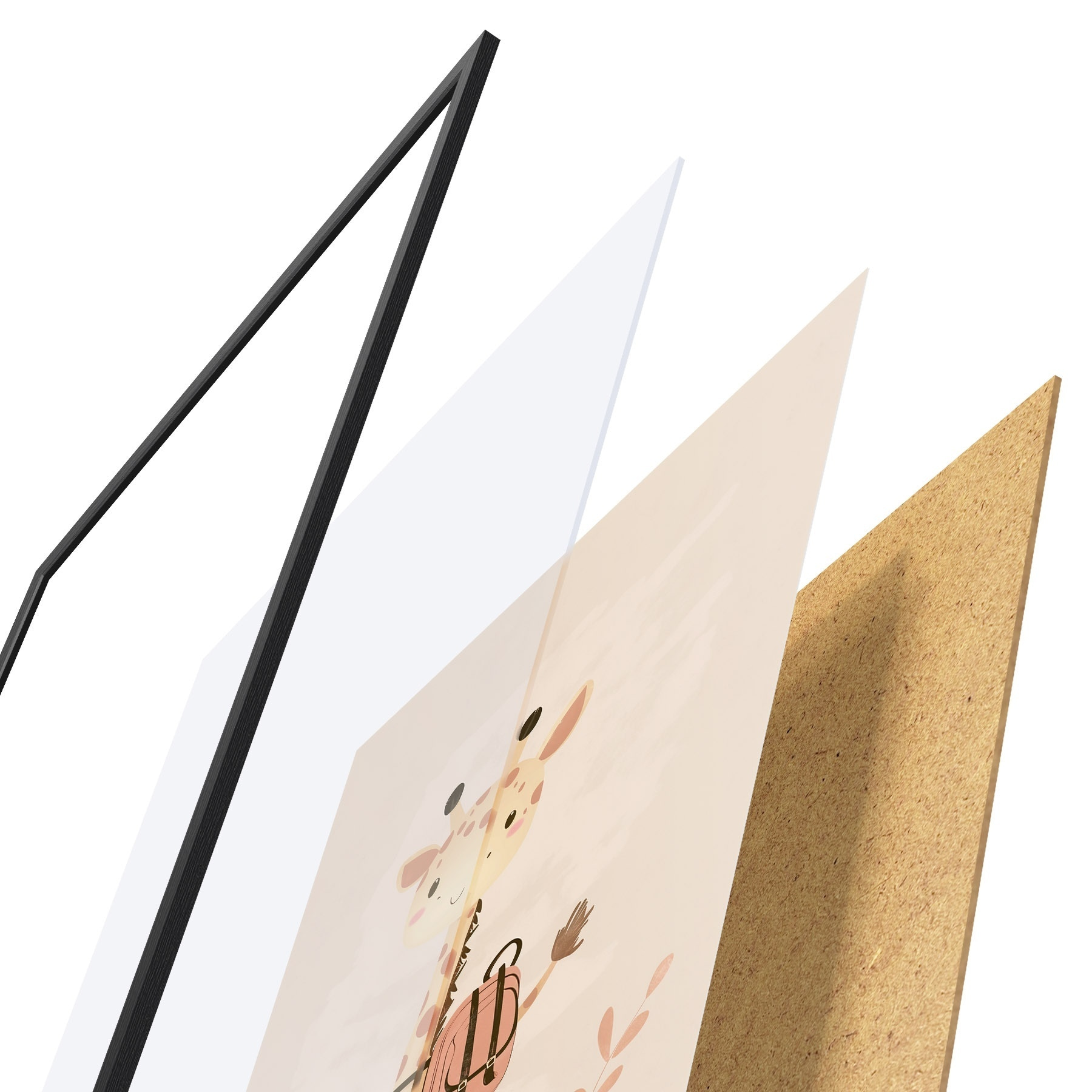 Plakát se skládá z rámu, plexiskla, tištěného obrazu a dřevotřískového podkladu. Díky úchytům na zadní straně lze plakát ihned zavěsit na zeď.