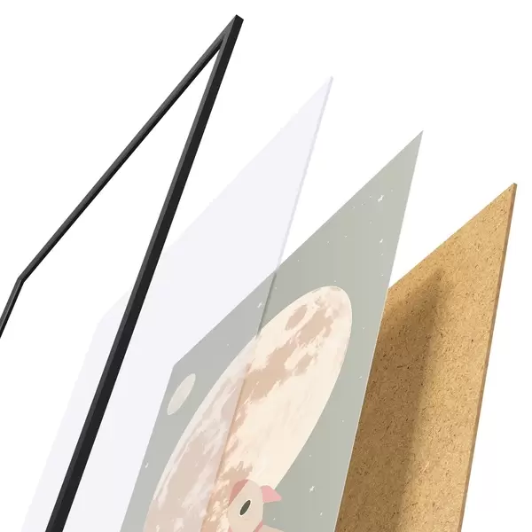 Plakát se skládá z rámu, plexiskla, tištěného obrazu a dřevotřískového podkladu. Díky úchytům na zadní straně lze plakát ihned zavěsit na zeď.
