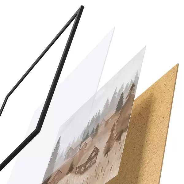 Plakát se skládá z rámu, plexiskla, tištěného obrazu a dřevotřískového podkladu. Díky úchytům na zadní straně lze plakát ihned zavěsit na zeď.