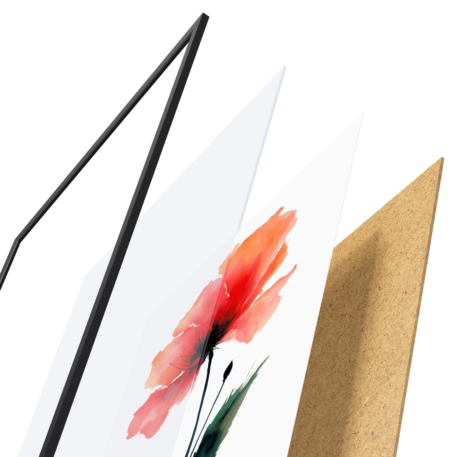 Plakát se skládá z rámu, plexiskla, tištěného obrazu a dřevotřískového podkladu. Díky úchytům na zadní straně lze plakát ihned zavěsit na zeď.