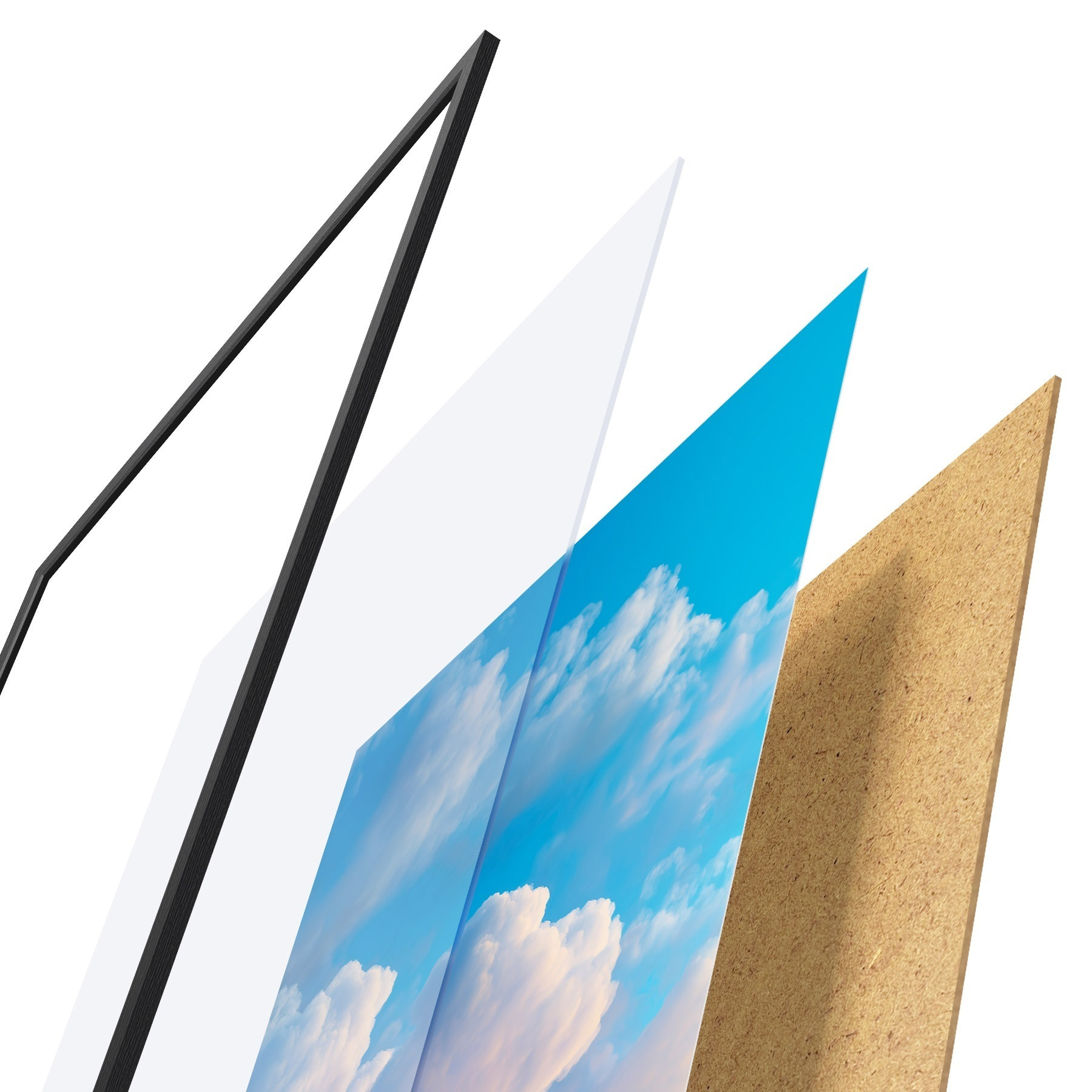 Plakát se skládá z rámu, plexiskla, tištěného obrazu a dřevotřískového podkladu. Díky úchytům na zadní straně lze plakát ihned zavěsit na zeď.