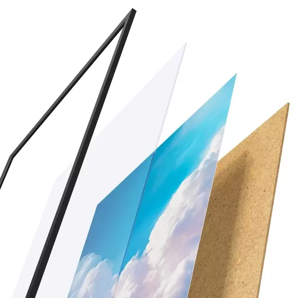 Plakát se skládá z rámu, plexiskla, tištěného obrazu a dřevotřískového podkladu. Díky úchytům na zadní straně lze plakát ihned zavěsit na zeď.