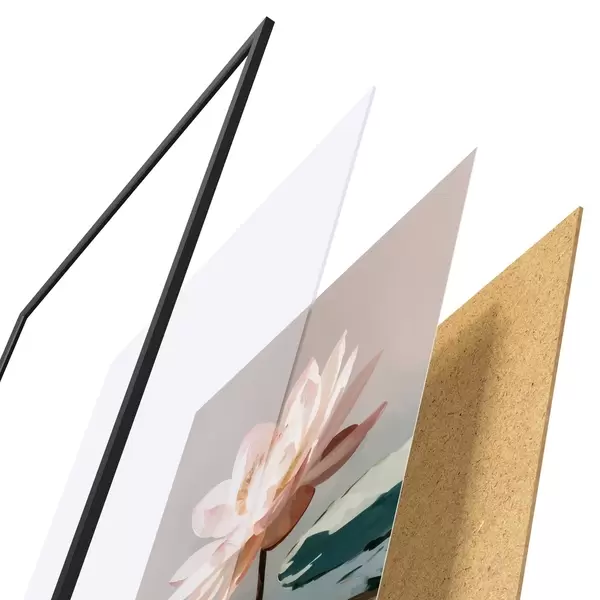 Plakát se skládá z rámu, plexiskla, tištěného obrazu a dřevotřískového podkladu. Díky úchytům na zadní straně lze plakát ihned zavěsit na zeď.
