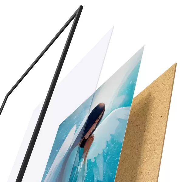 Plakát se skládá z rámu, plexiskla, tištěného obrazu a dřevotřískového podkladu. Díky úchytům na zadní straně lze plakát ihned zavěsit na zeď.