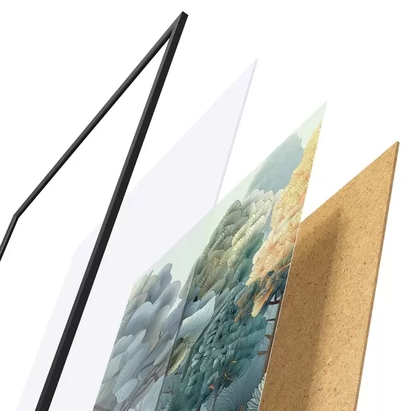 Plakát se skládá z rámu, plexiskla, tištěného obrazu a dřevotřískového podkladu. Díky úchytům na zadní straně lze plakát ihned zavěsit na zeď.