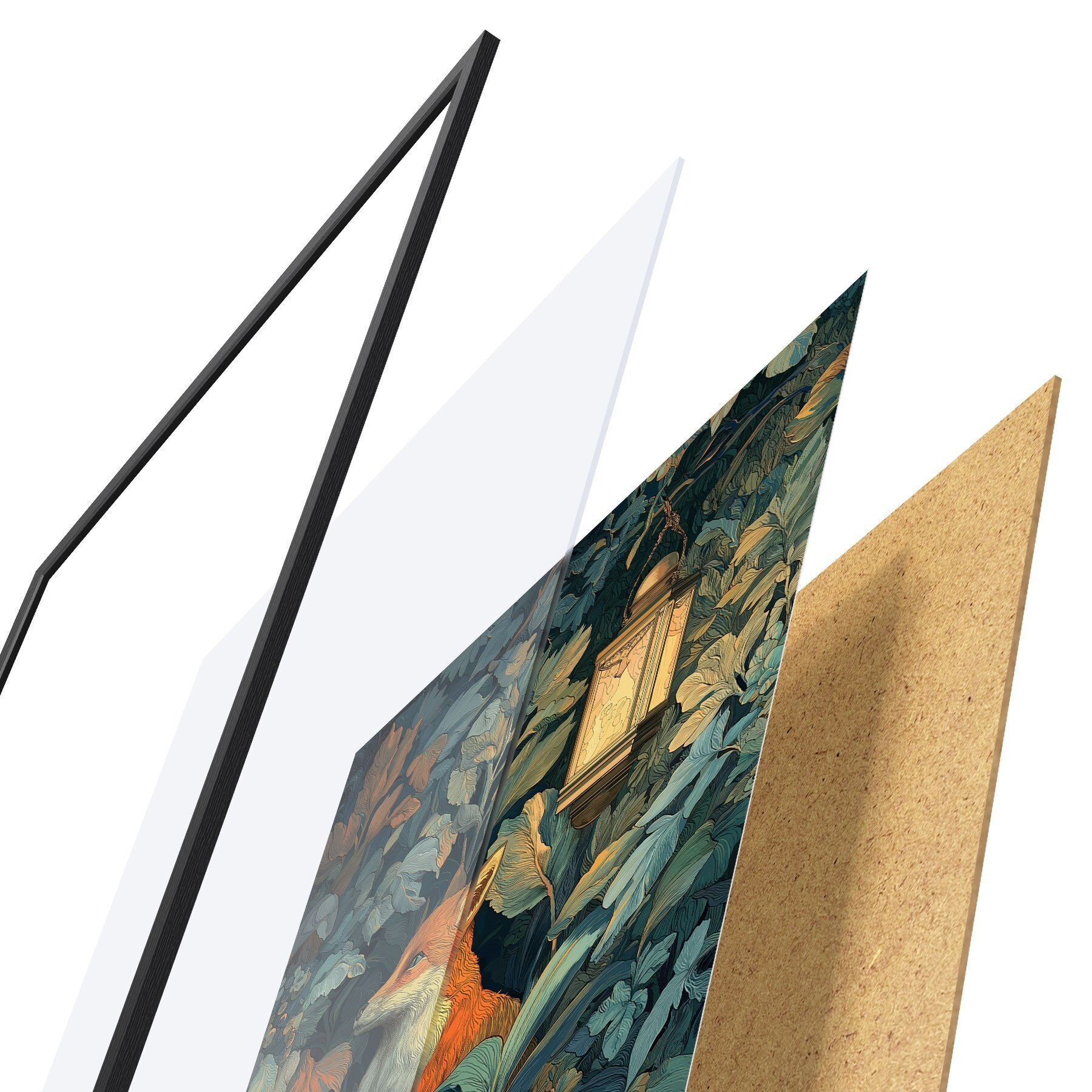 Plakát se skládá z rámu, plexiskla, tištěného obrazu a dřevotřískového podkladu. Díky úchytům na zadní straně lze plakát ihned zavěsit na zeď.
