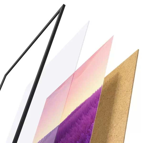 Plakát se skládá z rámu, plexiskla, tištěného obrazu a dřevotřískového podkladu. Díky úchytům na zadní straně lze plakát ihned zavěsit na zeď.