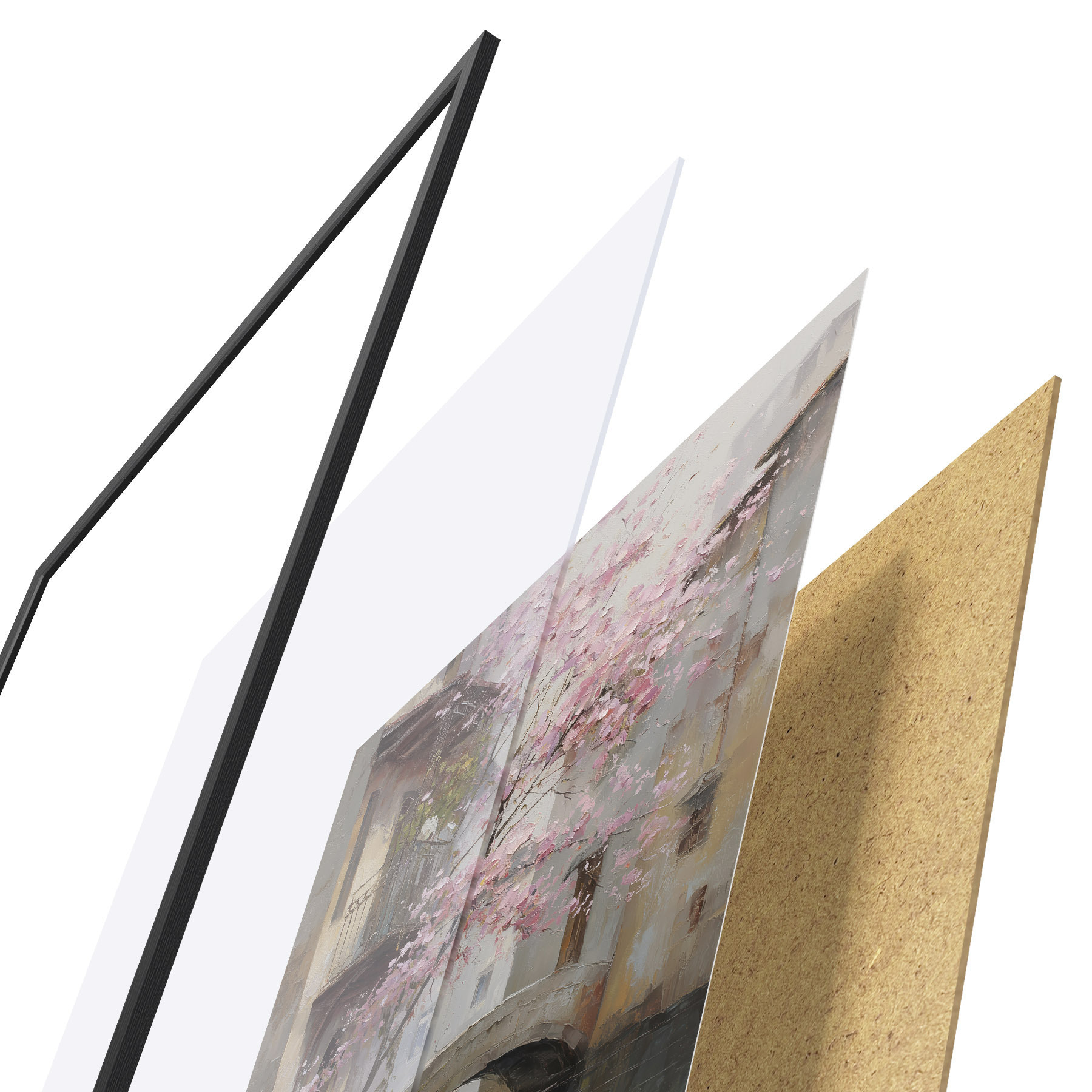 Plakát se skládá z rámu, plexiskla, tištěného obrazu a dřevotřískového podkladu. Díky úchytům na zadní straně lze plakát ihned zavěsit na zeď.