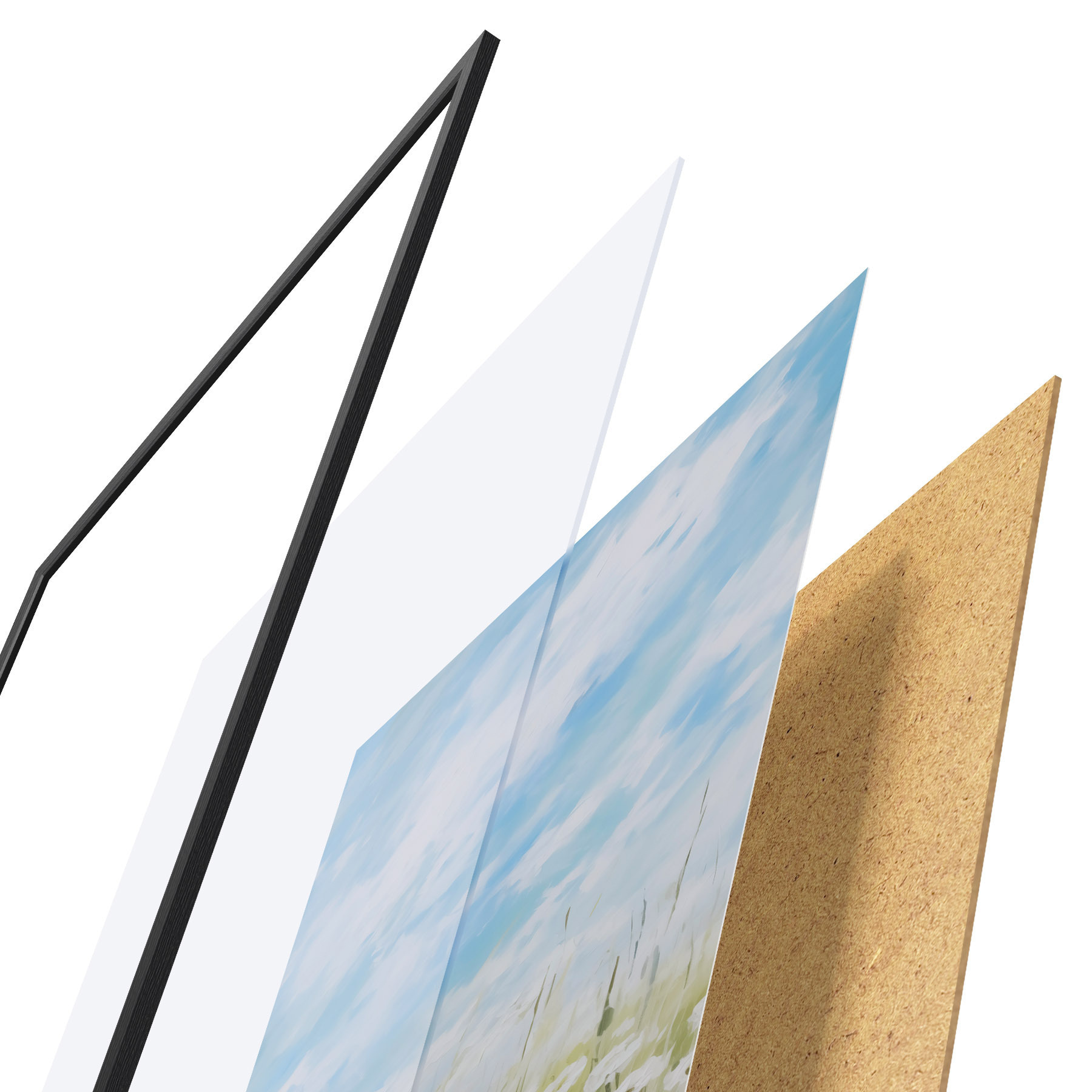 Plakát se skládá z rámu, plexiskla, tištěného obrazu a dřevotřískového podkladu. Díky úchytům na zadní straně lze plakát ihned zavěsit na zeď.