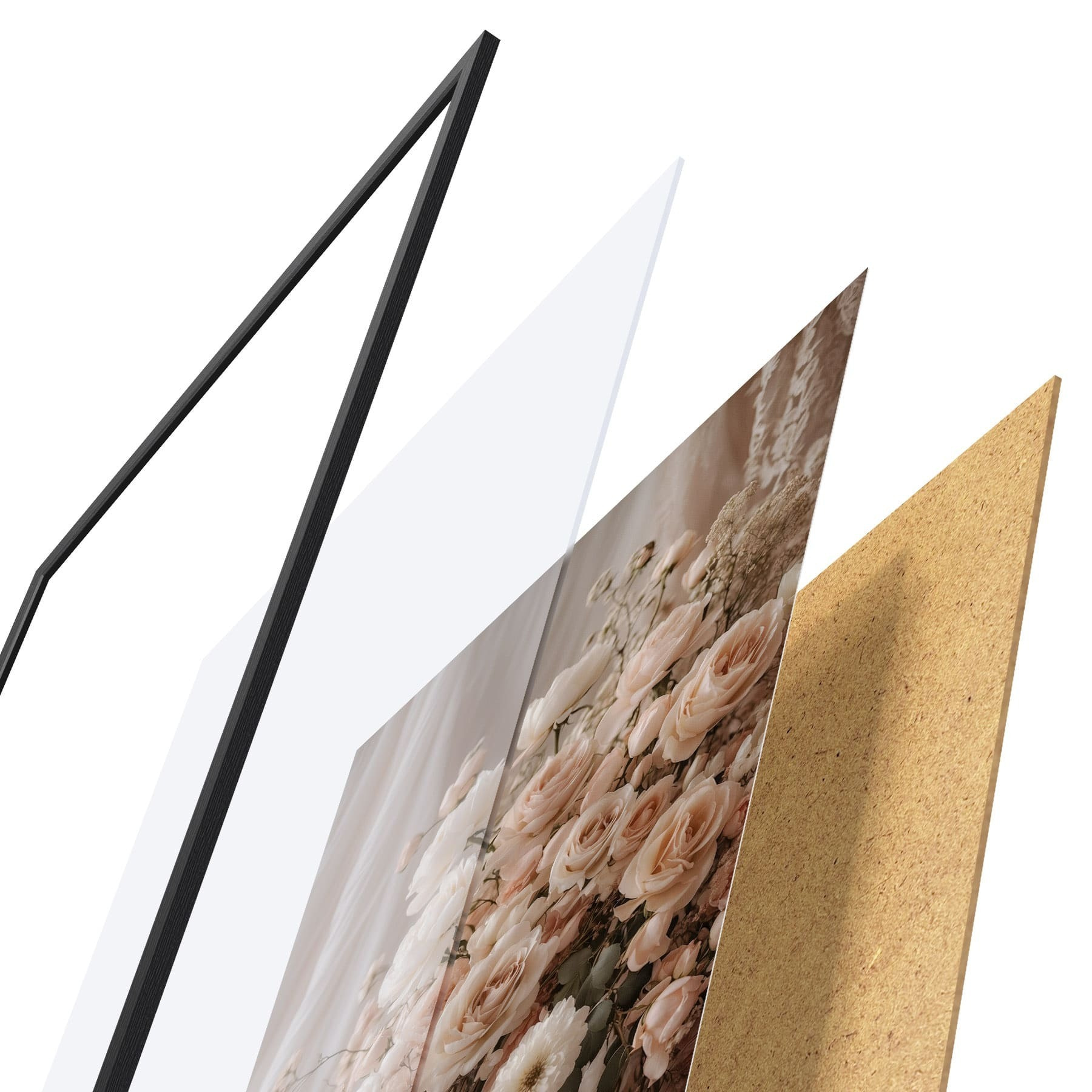 Plakát se skládá z rámu, plexiskla, tištěného obrazu a dřevotřískového podkladu. Díky úchytům na zadní straně lze plakát ihned zavěsit na zeď.