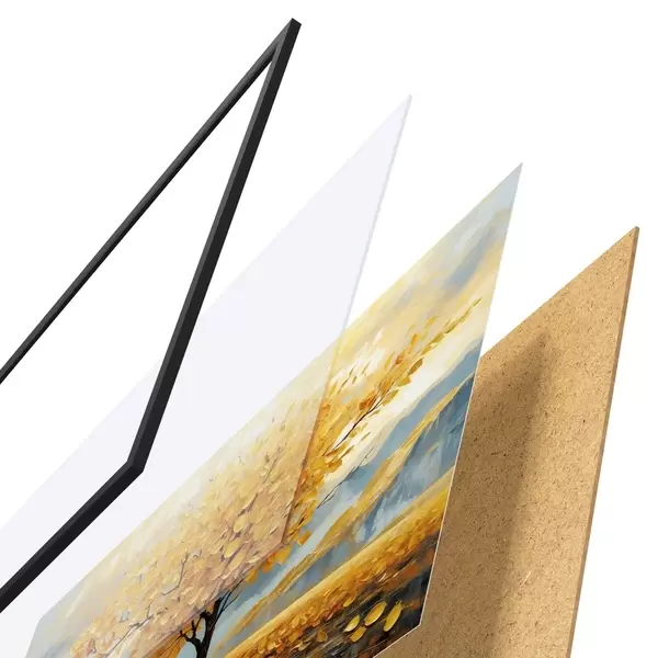 Plakát se skládá z rámu, plexiskla, tištěného obrazu a dřevotřískového podkladu. Díky úchytům na zadní straně lze plakát ihned zavěsit na zeď.