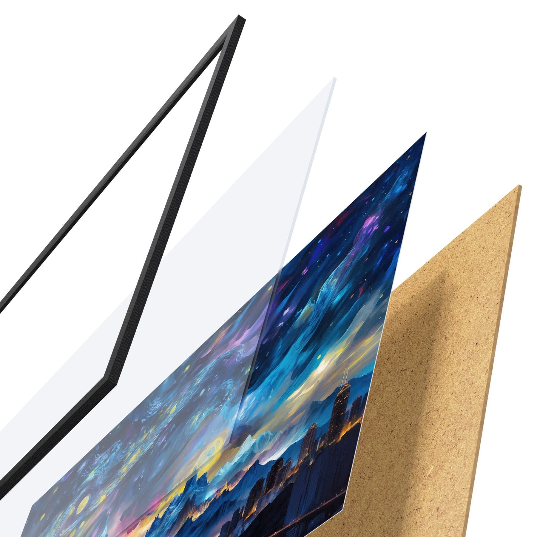 Plakát se skládá z rámu, plexiskla, tištěného obrazu a dřevotřískového podkladu. Díky úchytům na zadní straně lze plakát ihned zavěsit na zeď.
