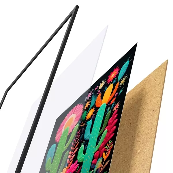 Plakát se skládá z rámu, plexiskla, tištěného obrazu a dřevotřískového podkladu. Díky úchytům na zadní straně lze plakát ihned zavěsit na zeď.