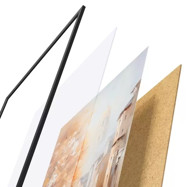 Plakát se skládá z rámu, plexiskla, tištěného obrazu a dřevotřískového podkladu. Díky úchytům na zadní straně lze plakát ihned zavěsit na zeď.