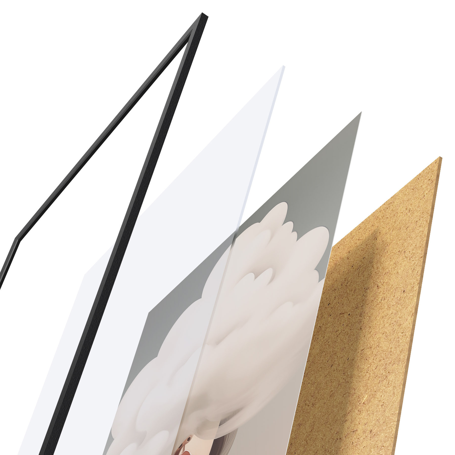 Plakát se skládá z rámu, plexiskla, tištěného obrazu a dřevotřískového podkladu. Díky úchytům na zadní straně lze plakát ihned zavěsit na zeď.