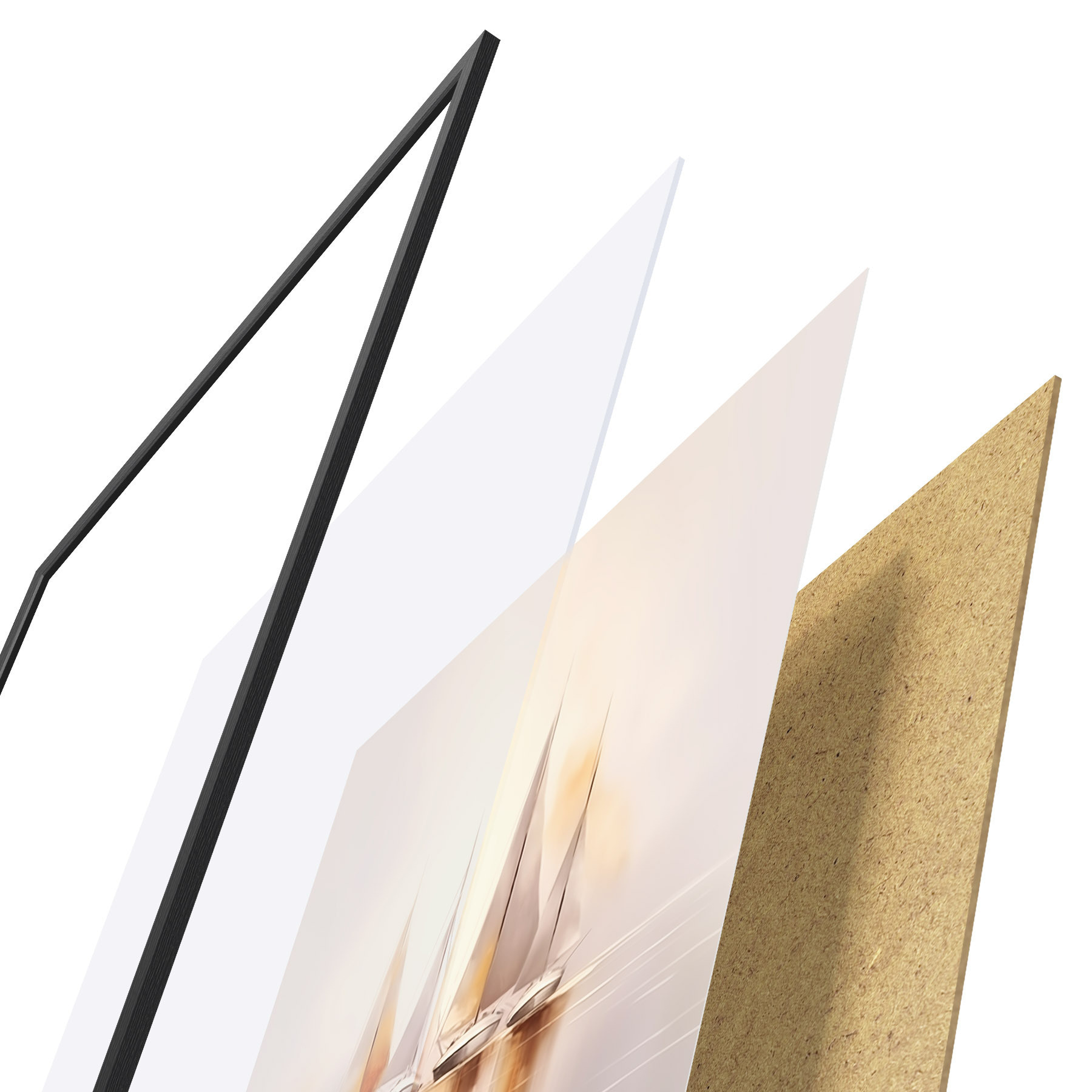 Plakát se skládá z rámu, plexiskla, tištěného obrazu a dřevotřískového podkladu. Díky úchytům na zadní straně lze plakát ihned zavěsit na zeď.