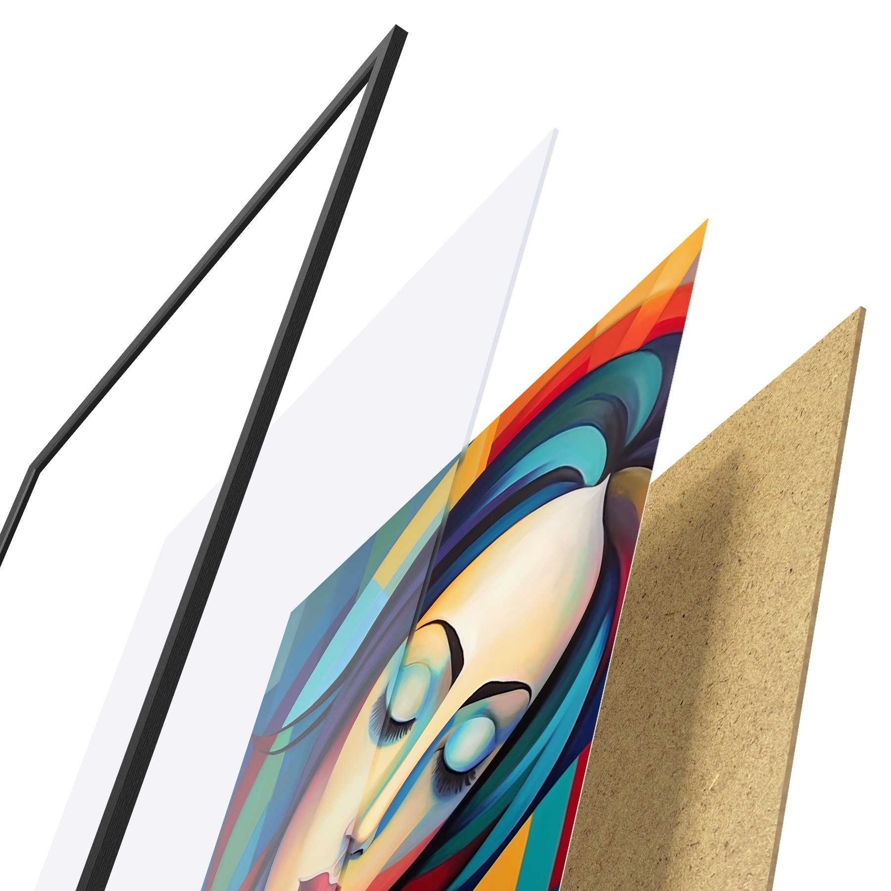 Plakát se skládá z rámu, plexiskla, tištěného obrazu a dřevotřískového podkladu. Díky úchytům na zadní straně lze plakát ihned zavěsit na zeď.