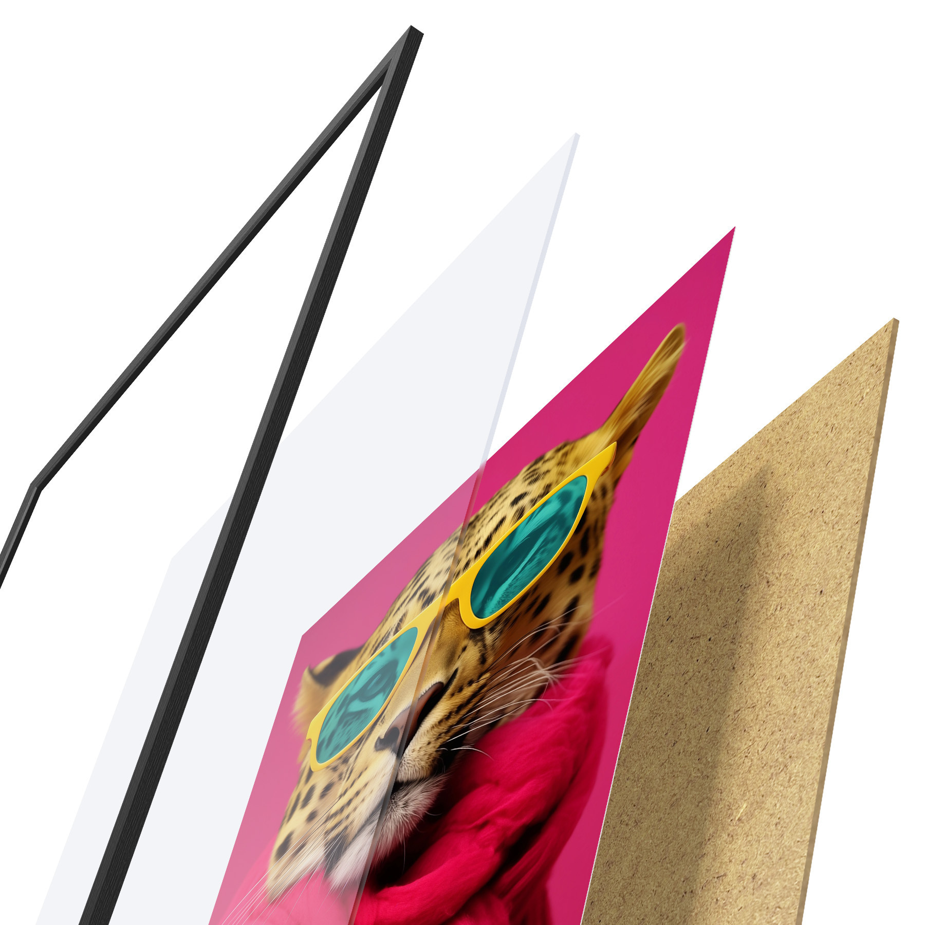 Plakát se skládá z rámu, plexiskla, tištěného obrazu a dřevotřískového podkladu. Díky úchytům na zadní straně lze plakát ihned zavěsit na zeď.