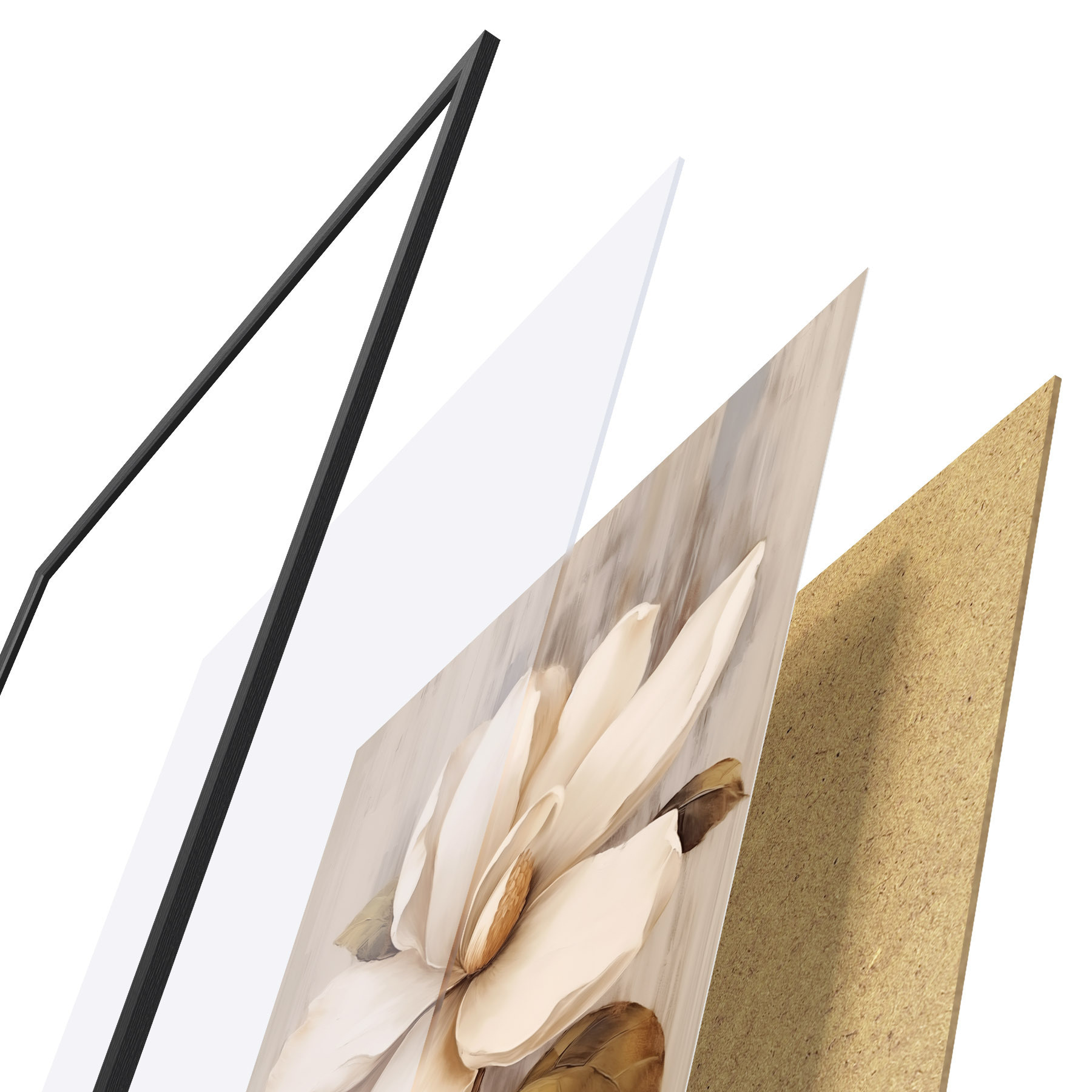 Plakát se skládá z rámu, plexiskla, tištěného obrazu a dřevotřískového podkladu. Díky úchytům na zadní straně lze plakát ihned zavěsit na zeď.