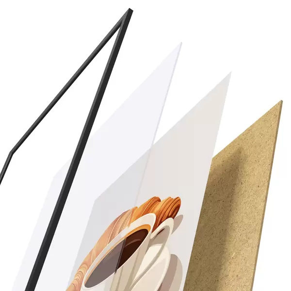 Plakát se skládá z rámu, plexiskla, tištěného obrazu a dřevotřískového podkladu. Díky úchytům na zadní straně lze plakát ihned zavěsit na zeď.