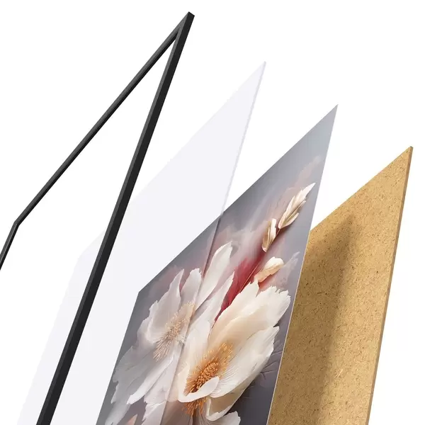 Plakát se skládá z rámu, plexiskla, tištěného obrazu a dřevotřískového podkladu. Díky úchytům na zadní straně lze plakát ihned zavěsit na zeď.