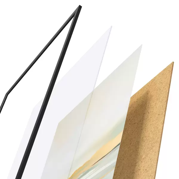 Plakát se skládá z rámu, plexiskla, tištěného obrazu a dřevotřískového podkladu. Díky úchytům na zadní straně lze plakát ihned zavěsit na zeď.