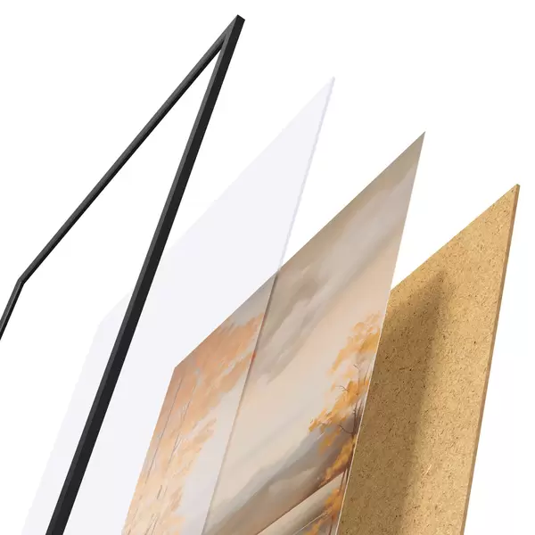 Plakát se skládá z rámu, plexiskla, tištěného obrazu a dřevotřískového podkladu. Díky úchytům na zadní straně lze plakát ihned zavěsit na zeď.
