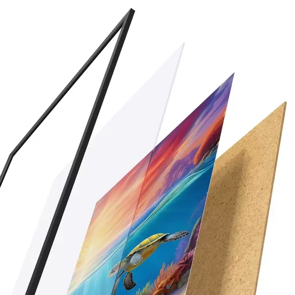Plakát se skládá z rámu, plexiskla, tištěného obrazu a dřevotřískového podkladu. Díky úchytům na zadní straně lze plakát ihned zavěsit na zeď.