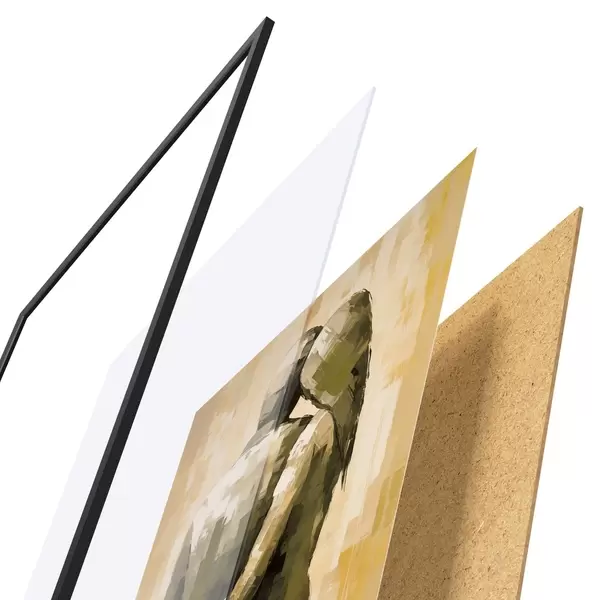 Plakát se skládá z rámu, plexiskla, tištěného obrazu a dřevotřískového podkladu. Díky úchytům na zadní straně lze plakát ihned zavěsit na zeď.