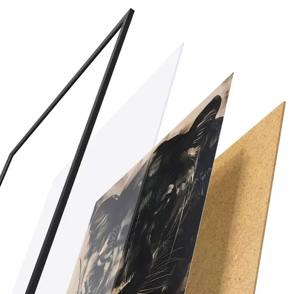 Plakát se skládá z rámu, plexiskla, tištěného obrazu a dřevotřískového podkladu. Díky úchytům na zadní straně lze plakát ihned zavěsit na zeď.