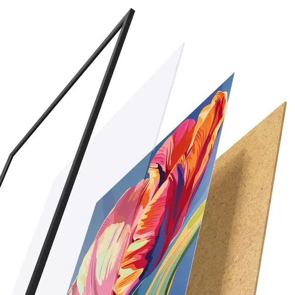 Plakát se skládá z rámu, plexiskla, tištěného obrazu a dřevotřískového podkladu. Díky úchytům na zadní straně lze plakát ihned zavěsit na zeď.
