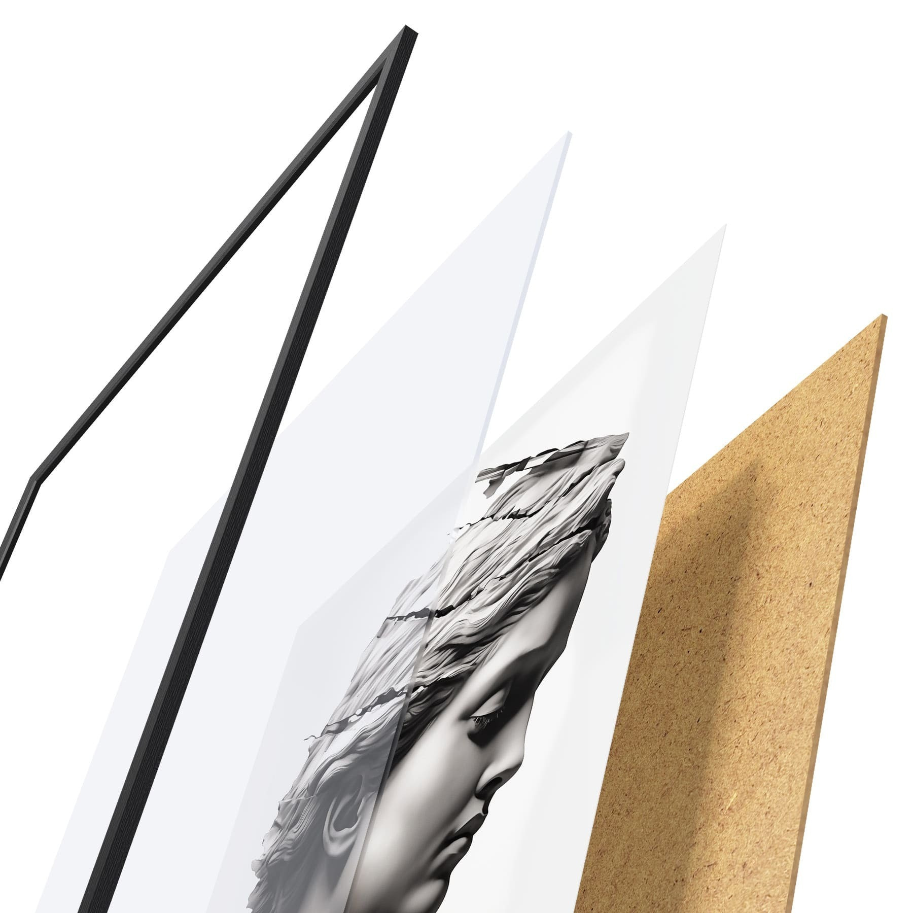 Plakát se skládá z rámu, plexiskla, tištěného obrazu a dřevotřískového podkladu. Díky úchytům na zadní straně lze plakát ihned zavěsit na zeď.