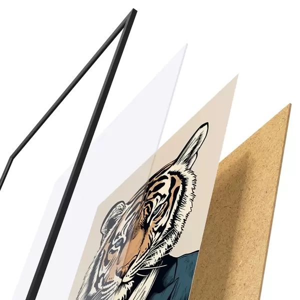 Plakát se skládá z rámu, plexiskla, tištěného obrazu a dřevotřískového podkladu. Díky úchytům na zadní straně lze plakát ihned zavěsit na zeď.