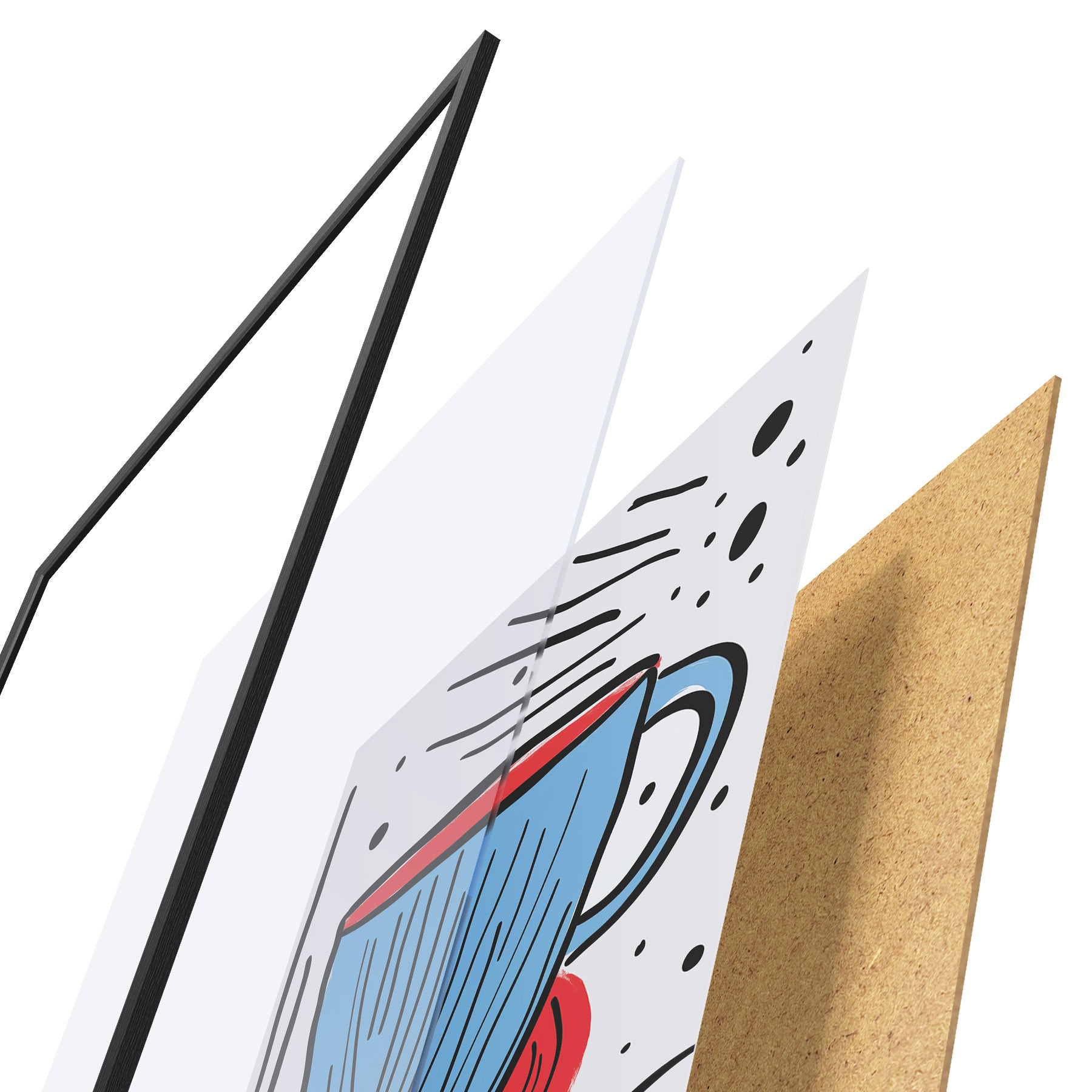 Plakát se skládá z rámu, plexiskla, tištěného obrazu a dřevotřískového podkladu. Díky úchytům na zadní straně lze plakát ihned zavěsit na zeď.