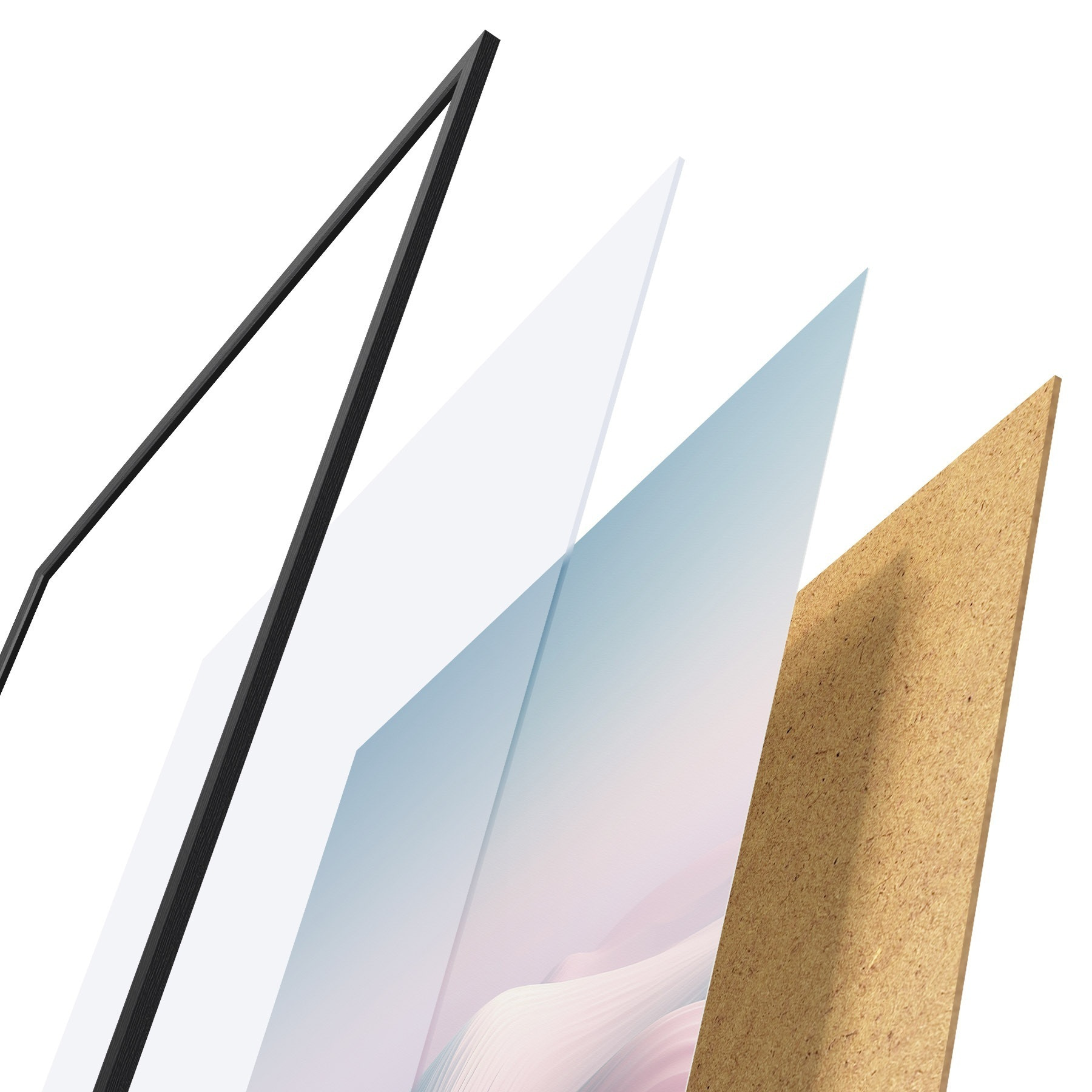 Plakát se skládá z rámu, plexiskla, tištěného obrazu a dřevotřískového podkladu. Díky úchytům na zadní straně lze plakát ihned zavěsit na zeď.