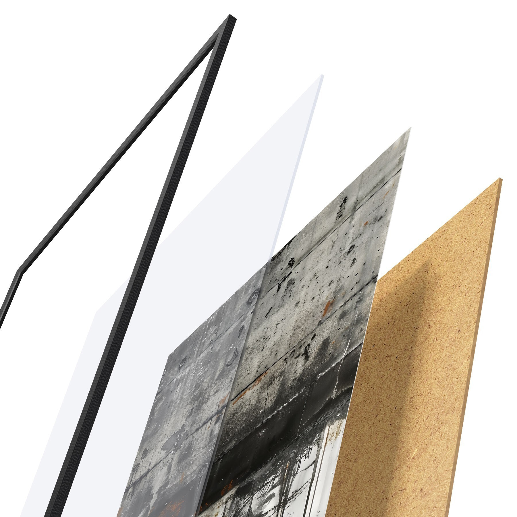 Plakát se skládá z rámu, plexiskla, tištěného obrazu a dřevotřískového podkladu. Díky úchytům na zadní straně lze plakát ihned zavěsit na zeď.