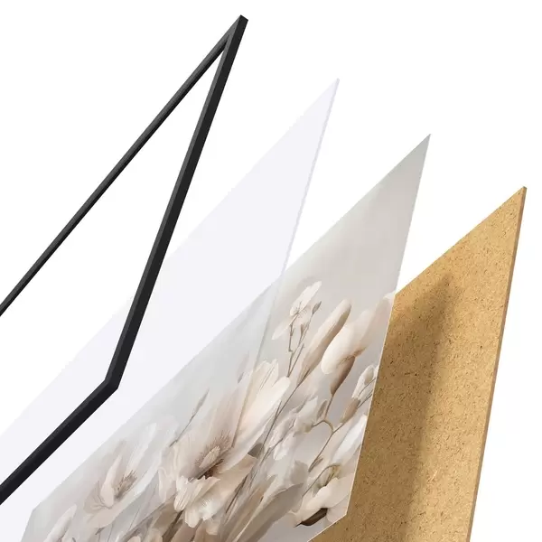 Plakát se skládá z rámu, plexiskla, tištěného obrazu a dřevotřískového podkladu. Díky úchytům na zadní straně lze plakát ihned zavěsit na zeď.