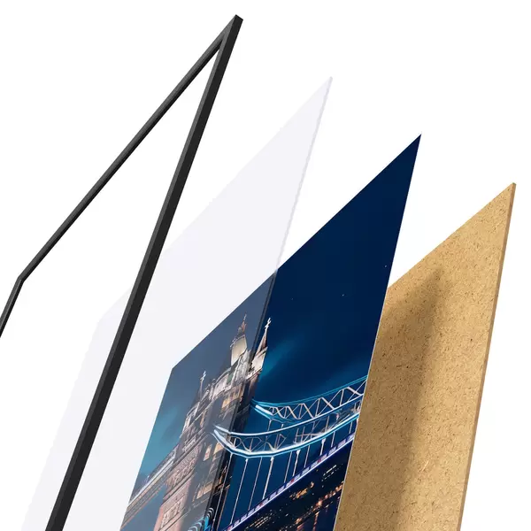 Plakát se skládá z rámu, plexiskla, tištěného obrazu a dřevotřískového podkladu. Díky úchytům na zadní straně lze plakát ihned zavěsit na zeď.