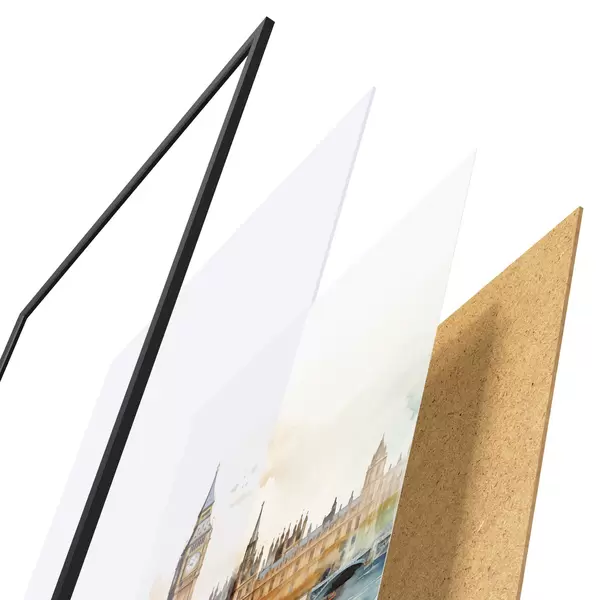 Plakát se skládá z rámu, plexiskla, tištěného obrazu a dřevotřískového podkladu. Díky úchytům na zadní straně lze plakát ihned zavěsit na zeď.