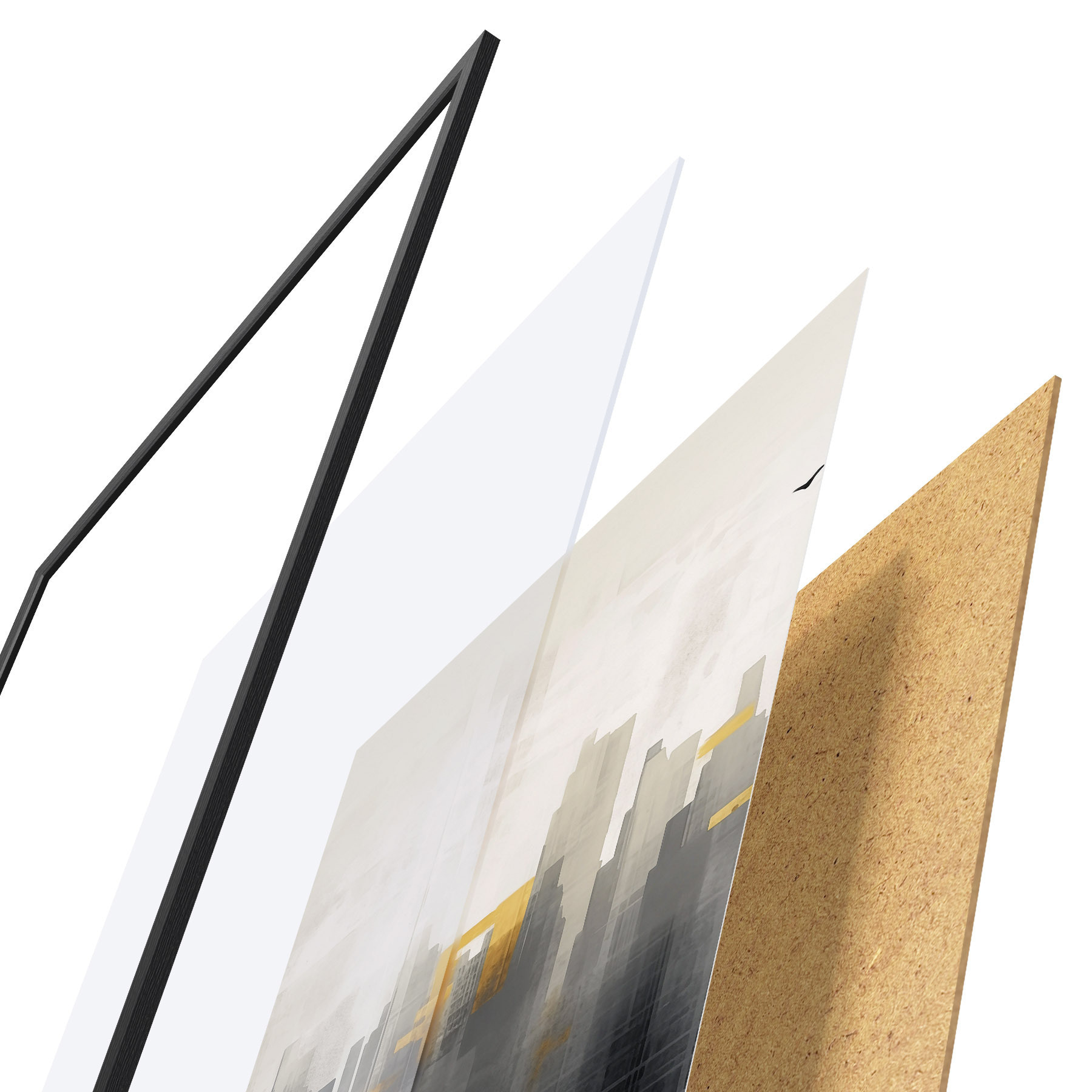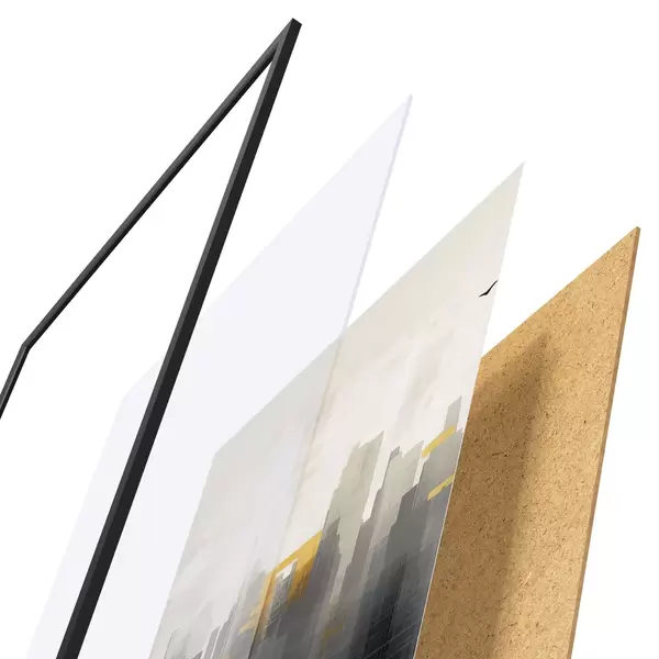 Plakát se skládá z rámu, plexiskla, tištěného obrazu a dřevotřískového podkladu. Díky úchytům na zadní straně lze plakát ihned zavěsit na zeď.