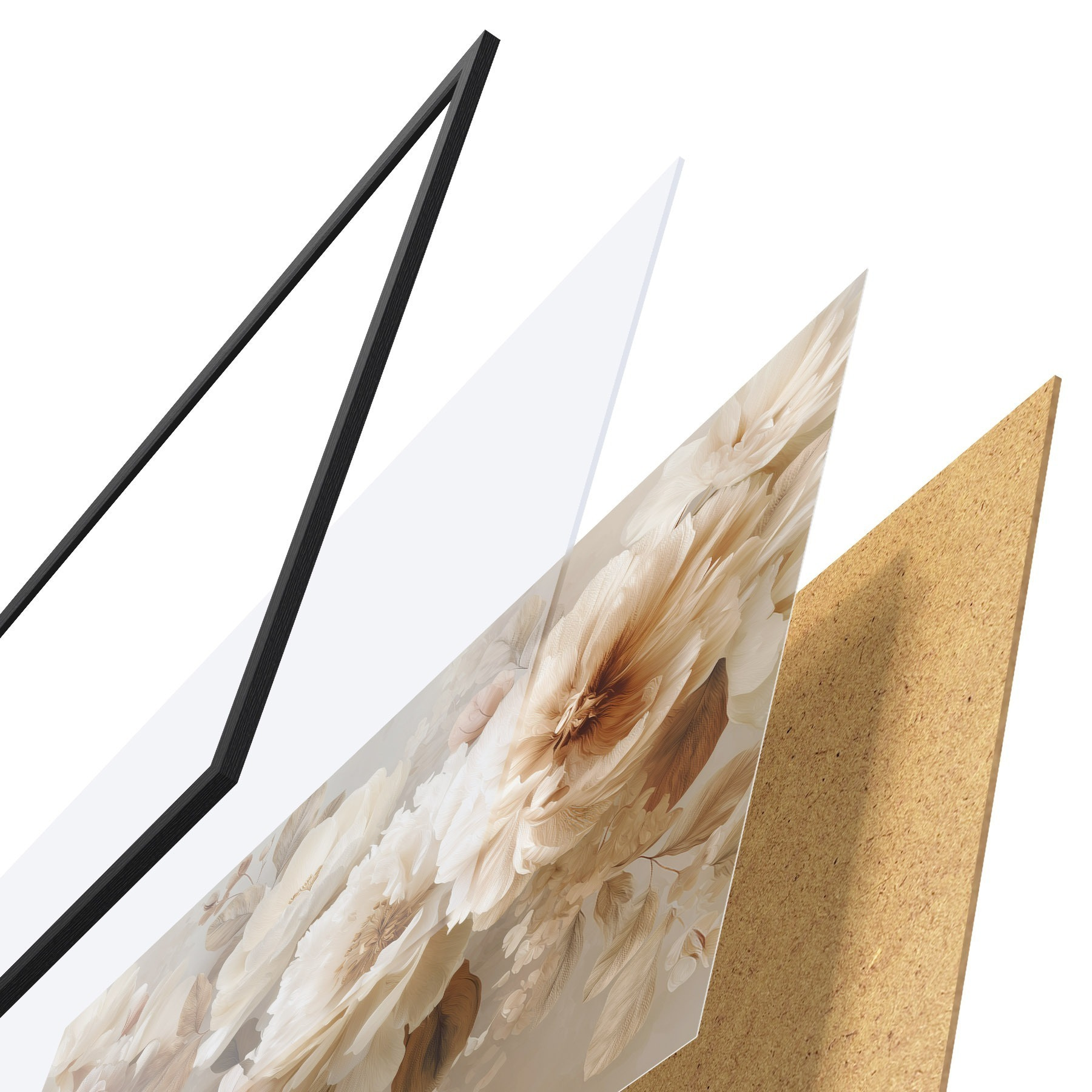 Plakát se skládá z rámu, plexiskla, tištěného obrazu a dřevotřískového podkladu. Díky úchytům na zadní straně lze plakát ihned zavěsit na zeď.