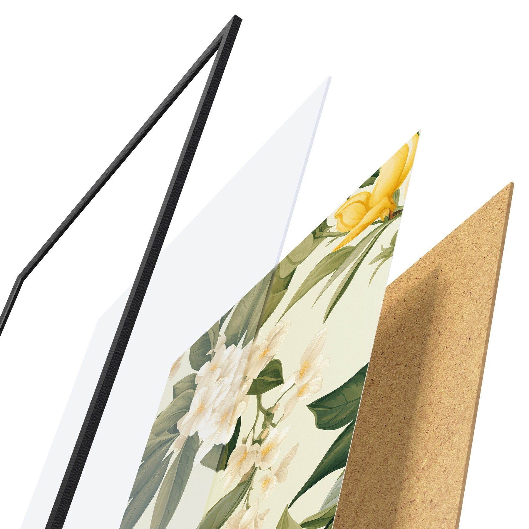 Plakát se skládá z rámu, plexiskla, tištěného obrazu a dřevotřískového podkladu. Díky úchytům na zadní straně lze plakát ihned zavěsit na zeď.