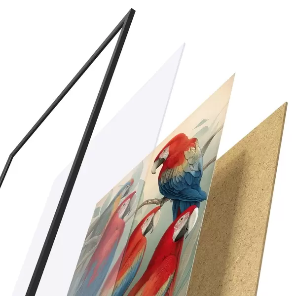 Plakát se skládá z rámu, plexiskla, tištěného obrazu a dřevotřískového podkladu. Díky úchytům na zadní straně lze plakát ihned zavěsit na zeď.
