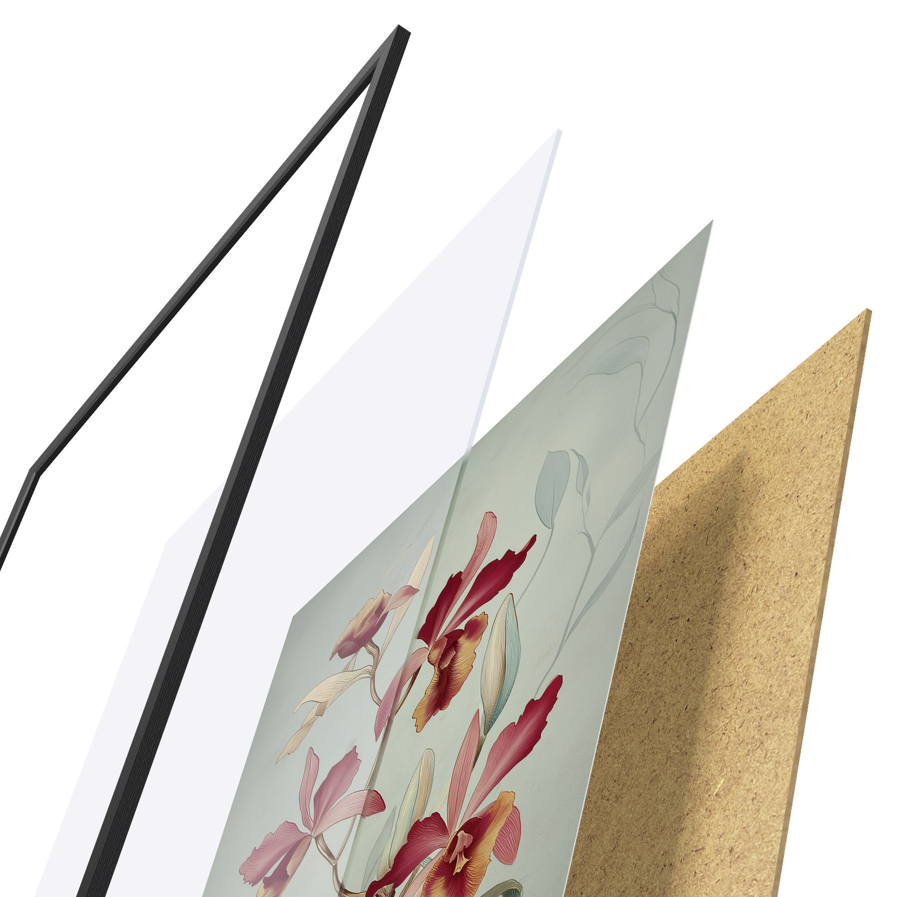 Plakát se skládá z rámu, plexiskla, tištěného obrazu a dřevotřískového podkladu. Díky úchytům na zadní straně lze plakát ihned zavěsit na zeď.