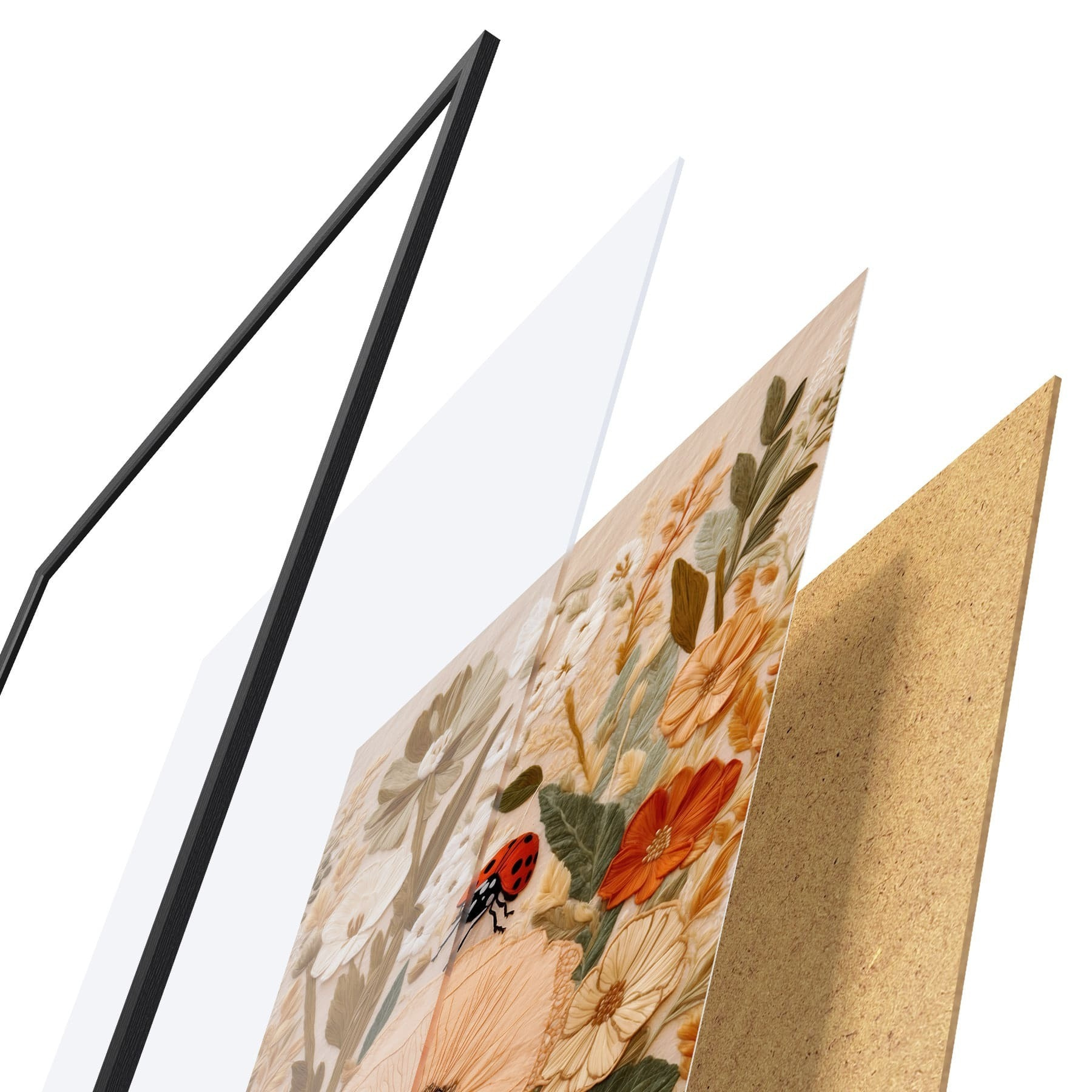 Plakát se skládá z rámu, plexiskla, tištěného obrazu a dřevotřískového podkladu. Díky úchytům na zadní straně lze plakát ihned zavěsit na zeď.