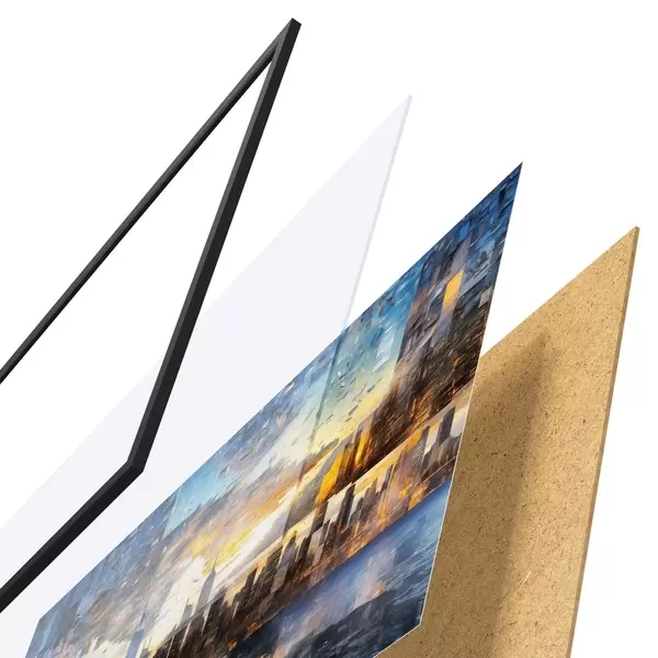 Plakát se skládá z rámu, plexiskla, tištěného obrazu a dřevotřískového podkladu. Díky úchytům na zadní straně lze plakát ihned zavěsit na zeď.