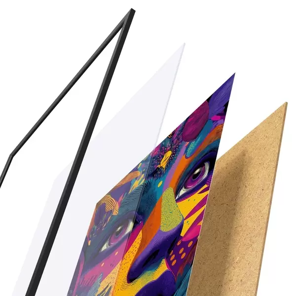 Plakát se skládá z rámu, plexiskla, tištěného obrazu a dřevotřískového podkladu. Díky úchytům na zadní straně lze plakát ihned zavěsit na zeď.